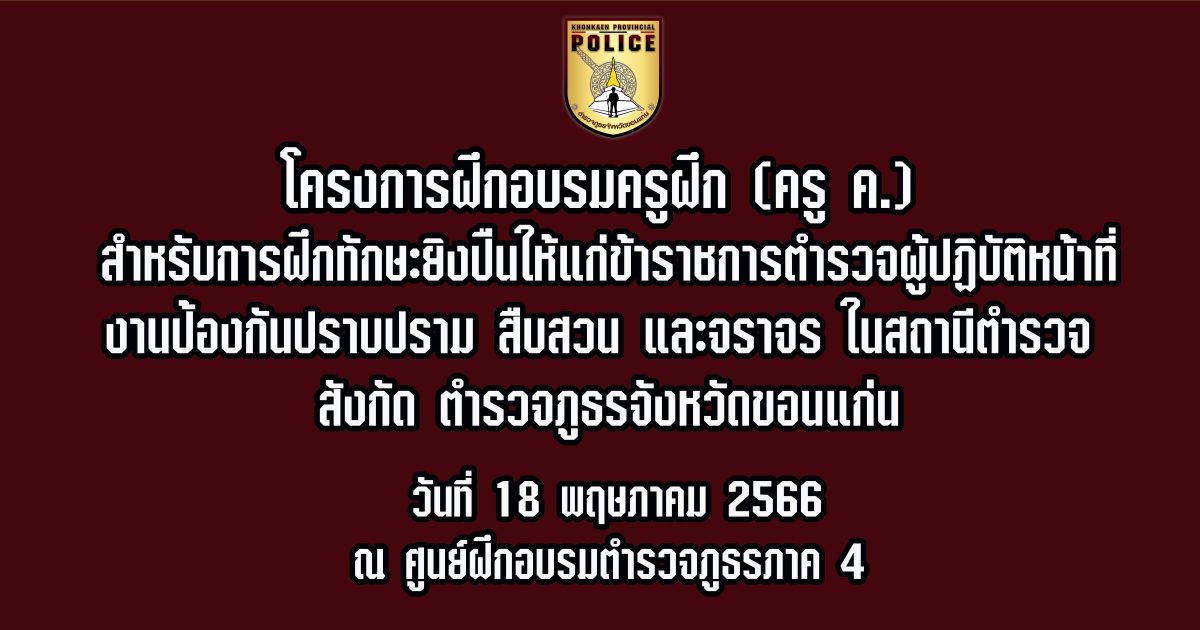 วันที่ 18 พ.ค.2566 เวลา 08.30 น. พ.ต.อ.ไพโรจน์ ไทยพุทรา รอง ผบก.ภ.จว.ขอนแก่น เป็นประธานในพิธีเปิดการฝึกอบรมครูฝึก (ครู ค.) สำหรับการฝึกทักษะยิงปืนให้แก่ข้าราชการตำรวจ ผู้ปฏิบัติหน้าที่งานป้องกันปราบปราม สืบสวน และจราจร ในสถานีตำรวจ สังกัด ภ.จว.ขอนแก่น โดยมี ผกก.ฝอ.ภ.จว.ขอนแก่น ,วิทยากรฝึกอบรม และผู้เข้ารบการฝึกอบรม เข้าร่วมพิธี ณ สนามยิงปืน ศฝร.ภ.4